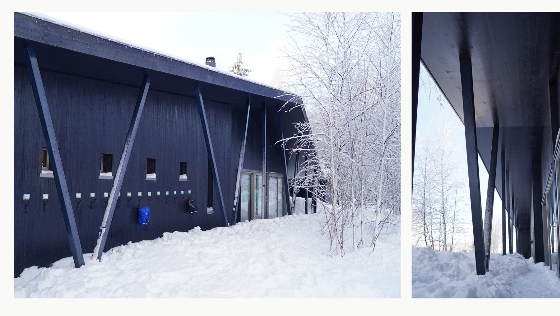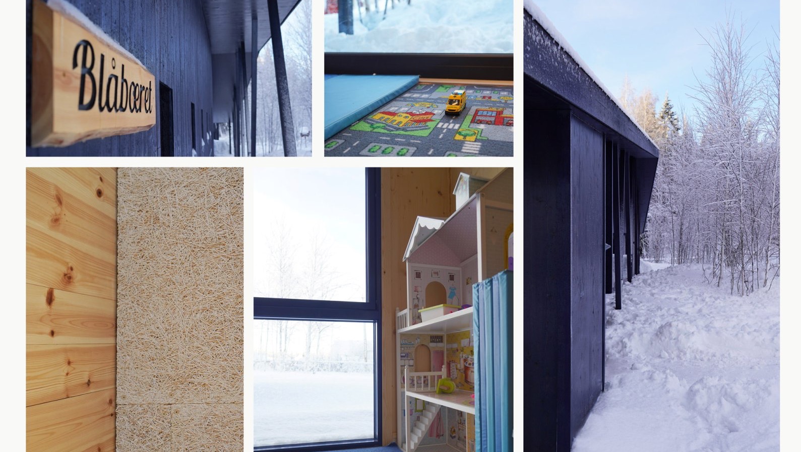 Avdelingene, bygget i massivtre, gir et sunt og lunt inneklima, med nøye planlagte rom som allrom, lekerom, kjøkken og garderober. Vedovner sørger for varme og en koselig atmosfære om vinteren. Bålhytta, like utenfor Blåbæret, er et naturlig samlingspunkt for mat, lek og naturopplevelser. Byggeprosjektet er gjennomført med respekt for omgivelsene, der bjørkeskogen fortsatt står tett inntil barnehagen.
